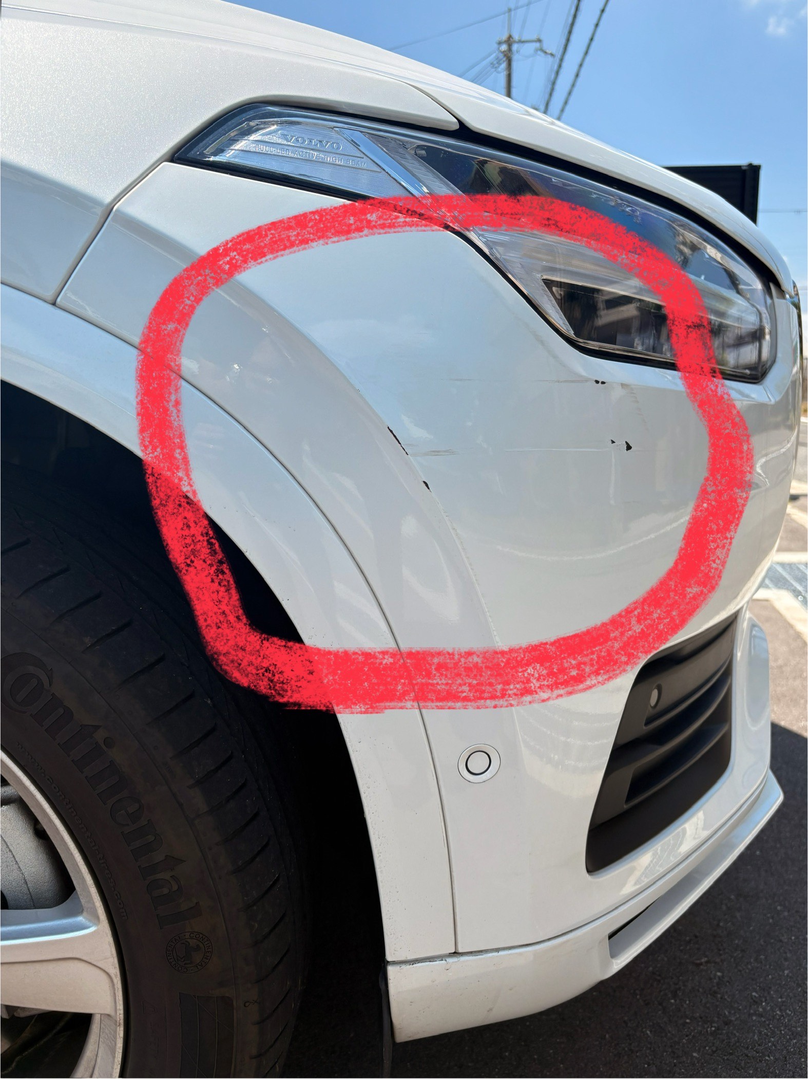 楽しい家族旅行中に、、、慣れない道でフロントバンパーを擦ってしまった、頑張って購入したボルボで、、、綺麗にしたい、、、と御入庫頂いたのはXC90です😢!!
